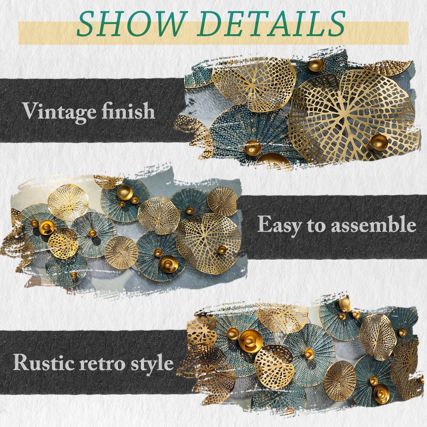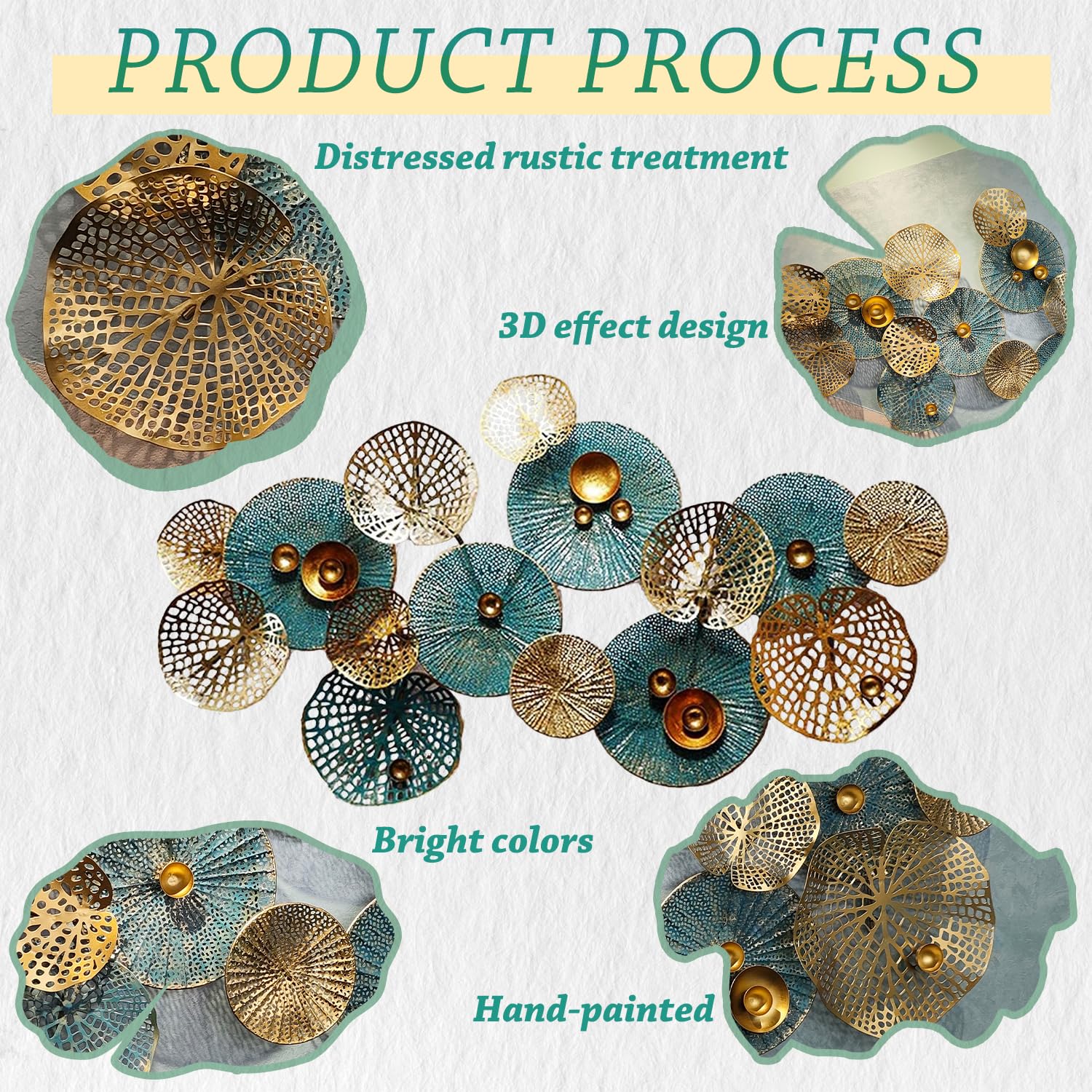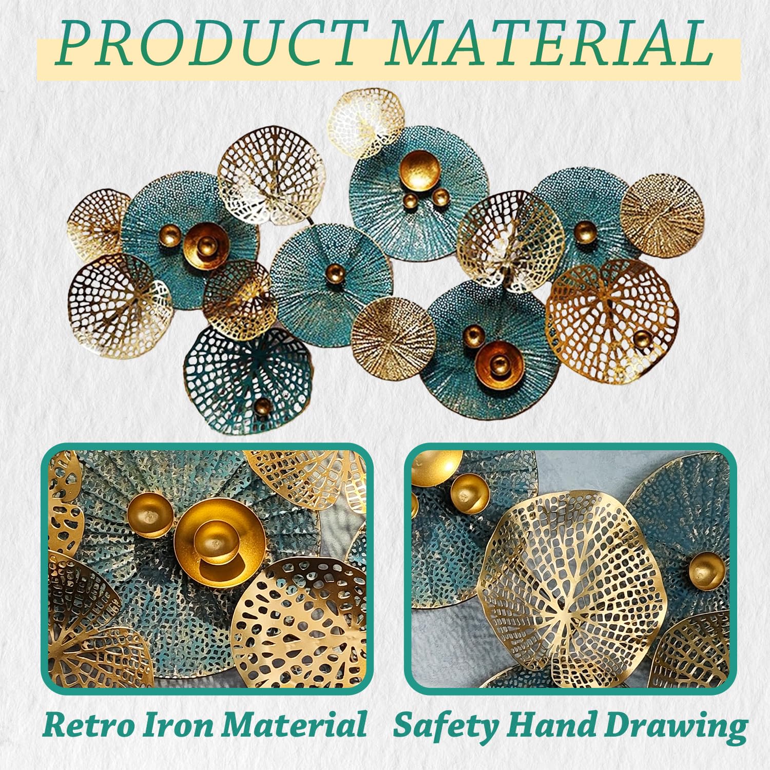 - Large Metal Wall Decor for Living Room : This large metal wall decor is multiple lotus leaves stacked on top of each other, 3D metal wall art will give you the character of vivid image on your wall. Blue, gold, and green colorful leaves wall decoration are stacking together for a natural feel.