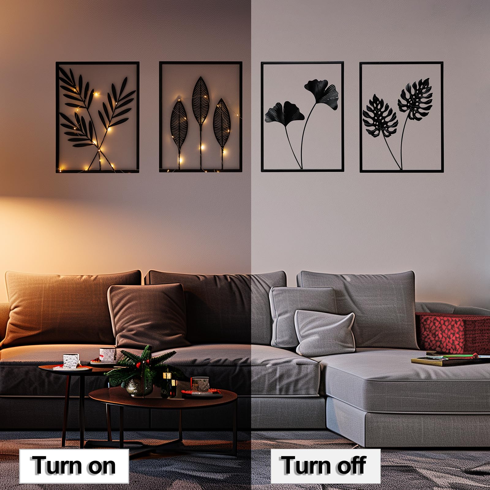 - METAL WALL DECORATION WITH LIGHTS: The 4 piece wall art decor with 2 light strips, you can wrap the light strips in the groove of the wall decor framed or directly wrap them around the leaves inside, adding a romantic and warm feeling. The light strip is powered by USB, and the USB cable is 2.5m/98inch long